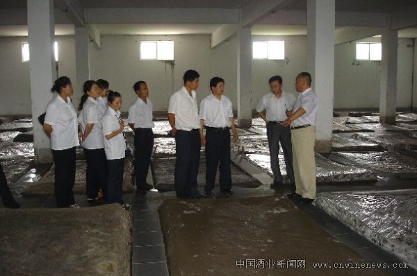 乾隆杯酒业副总经理董志东带领山东黄河王酒业有限公司一行参观酿造车间。