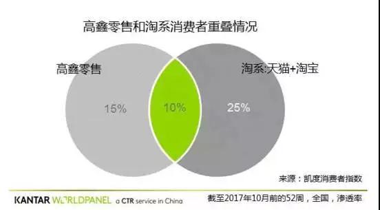 近日,凯度消费者指数研究发现,在快速消费品领域,只有10%的消费者既是高鑫零售的消费者,也是淘系(天猫+淘宝)的消费者。因此,通过线下实体店的接触,阿里有60%的机会去争取转化目前不是淘系的高鑫零售消费者红利,这群消费者多居住在三四线城市。